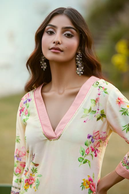 Beige kurta featuring floral and hummingbird prints with sequins hand embroidery. Paired with coordinating pink tulip pant.