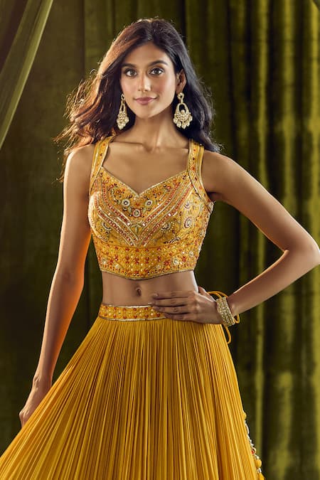 Yellow Silk, Organza, Georgette Sequins, Beads, Floral Hand Lehenga Set