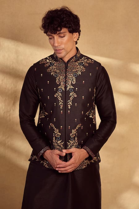 Black bundi featuring floral and honeycomb embroidered motifs with mirrorwork. Paired with a matching kurta and pant made from silk blend and poly silk.
