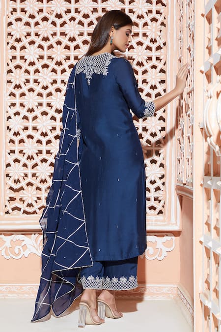 Navy blue straight kurta featuring gota, cord, and sequin embroidery with a floral motif neckline. Paired with embroidered palazzo and a dupatta with triangular cutwork hem.