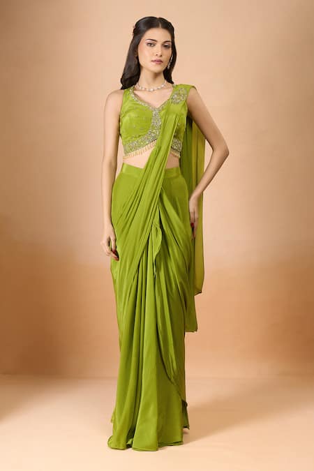 Green crepe pre-draped saree with a padded blouse featuring intricate embellishments. The saree is designed for an elegant look with a flowing silhouette.