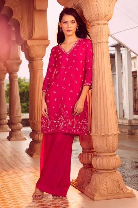 Hot pink straight kurta featuring scattered leaf and floral buttis hand embroidery. Paired with a straight pant for a complete look.