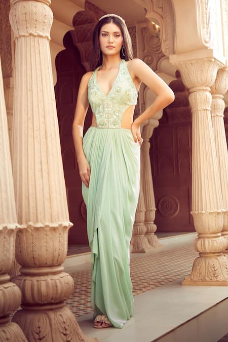 Mint green dress featuring a plunge V neck, side cut-out, and floral hand embroidery with beads and sequins. Paired with a long silk organza jacket adorned with embroidered buttis and cuffs.
