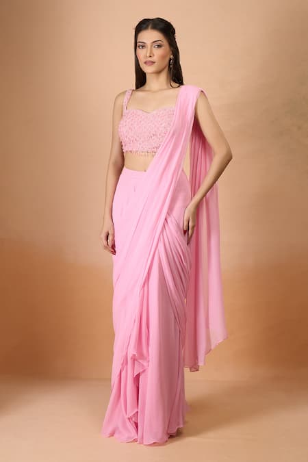 Pink georgette pre-draped saree featuring a padded blouse with intricate embellishments. Paired with a flowing drape that enhances the silhouette.