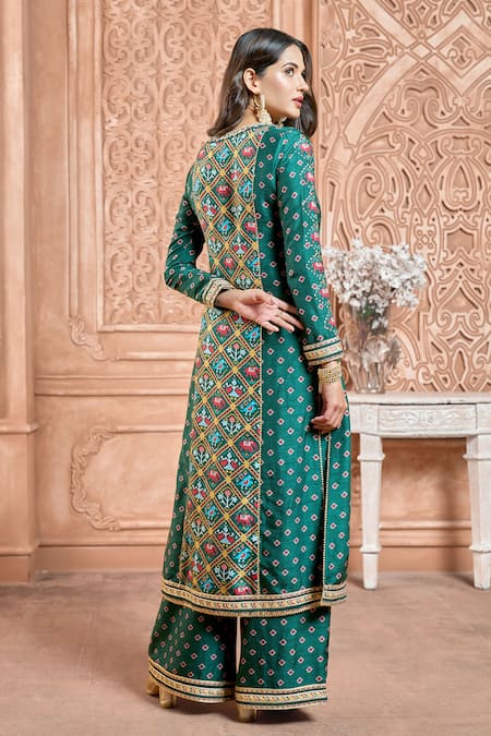 Green straight kurta featuring geometric animal prints and hand embroidered yoke. Paired with matching pant and lace hem dupatta with tassel edges.