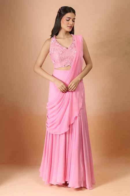 Pink pre-draped saree made from imported georgette with a padded blouse. The blouse features intricate embroidery and a back tie-up detail.