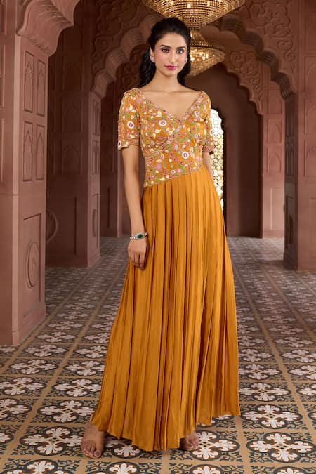 Yellow Modal, Satin Embroidery Plunge Neck Pleated And Floral Gown
