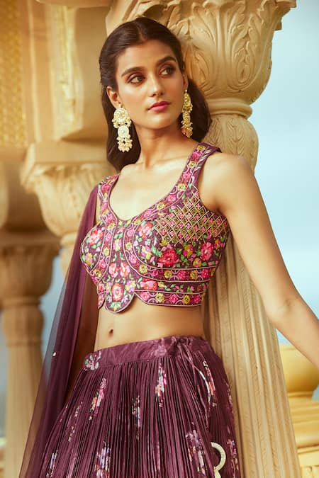 Wine pleated lehenga featuring all-over floral prints. It comes with a multi-colored floral embroidered padded blouse and a net dupatta with scattered buttis.