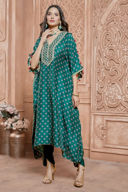 Green kaftan kurta featuring geometric prints and hand embroidered yoke and sleeve hem. Paired with lace hem tulip pant.