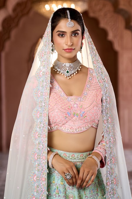 Powder sky blue lehenga crafted in raw silk featuring intricate pastel floral embroidery. Paired with a scalloped hem blouse and a matching bordered viscose organza dupatta.