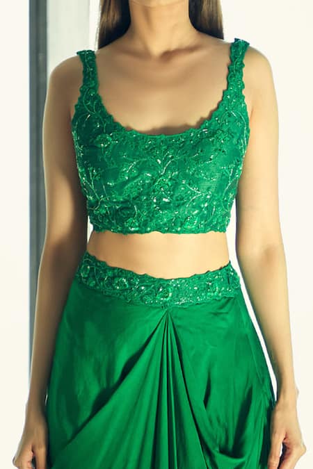 Green embroidered blouse featuring a V-neck and cutwork straps. Paired with a matching draped skirt and a front-open long jacket with a frill border.