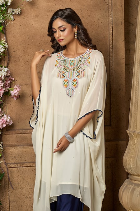 Off-white kurta featuring a round neckline, flared sleeves, and geometric thread embroidery on the yoke. Paired with a slip dress and harem pant, it showcases an asymmetric hem and scallop embroidered sleeve hem.