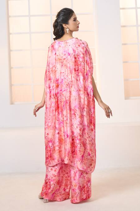 Pink kaftan kurta featuring all-over cherry blossom prints and embroidered highlights. Paired with a matching wide-legged pant and a plain pink bustier.