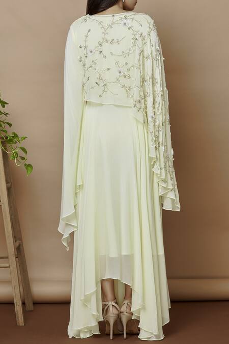Pale yellow midi dress featuring a round neckline and full sleeves. Accompanied by an embellished cape overlay and tafetta lining.