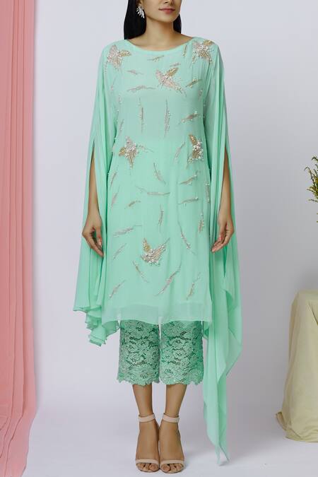 Sea green kaftan style kurta featuring leaf motif embroidery and slit flared sleeves. Paired with embroidered hemline cropped straight pants.