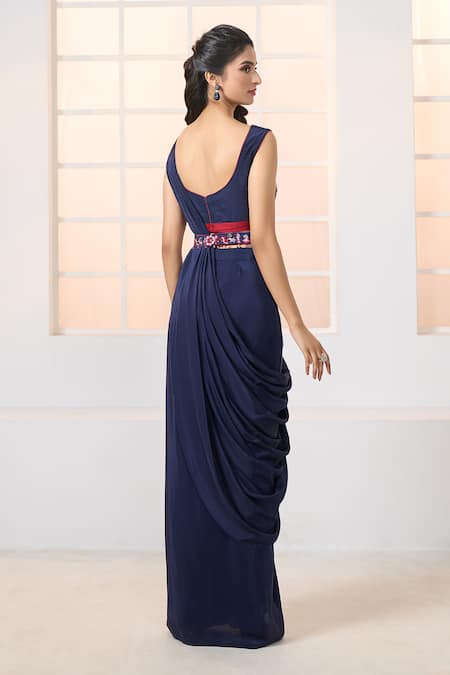 Navy blue jacket featuring semi-sheer sleeves with floral and paisley hand embroidery and sequin highlights. Paired with a matching bustier, draped skirt, and embroidered belt, along with a coordinating potli bag.