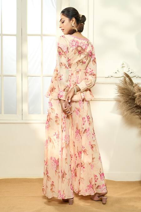 Multi colored peplum tunic featuring contrasting floral prints and hand embroidered highlights. Paired with matching printed flared pant, both made from viscose georgette.