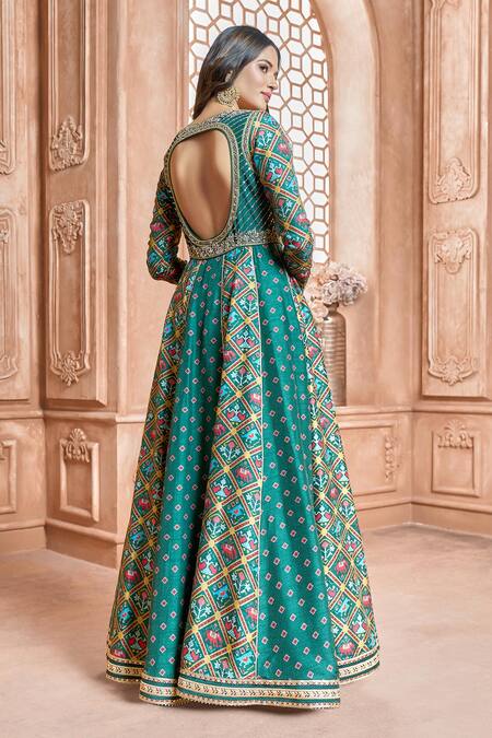 Green Anarkali featuring Patola print, back cutout, and embroidered bodice. Paired with a churidar and embroidered dupatta.