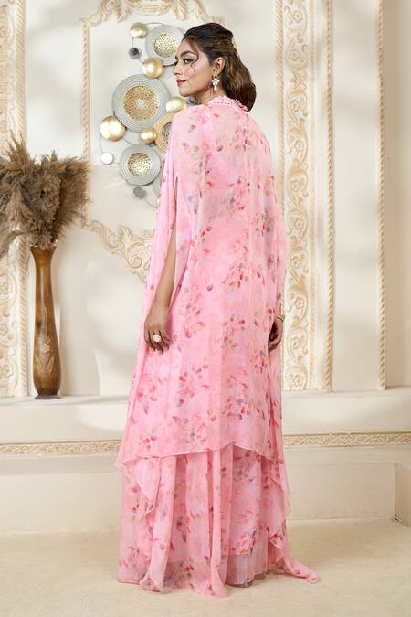Pink floral printed cape featuring draped sleeves, paired with a matching bustier and flared pant. The bustier has a back tassel tie and is complemented by a hand embroidered waistband on the pant.
