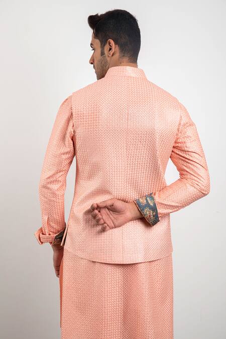 Peach bundi with silk intricate embroidered motifs, patch pocket & textured front button placket. Comes with pull-out pocket square.