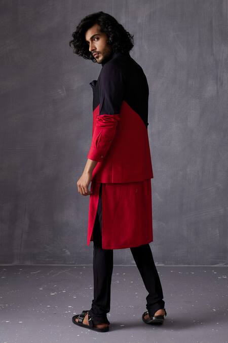 Black and red kurta featuring a colour block pattern and a mandarin collar. Paired with a matching churidar and designed with side slits for ease of movement.