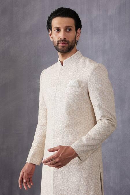 All over floral pattern dori hand embroidery, Front & side slits for ease of movement, Patch pocket detail on the achkan