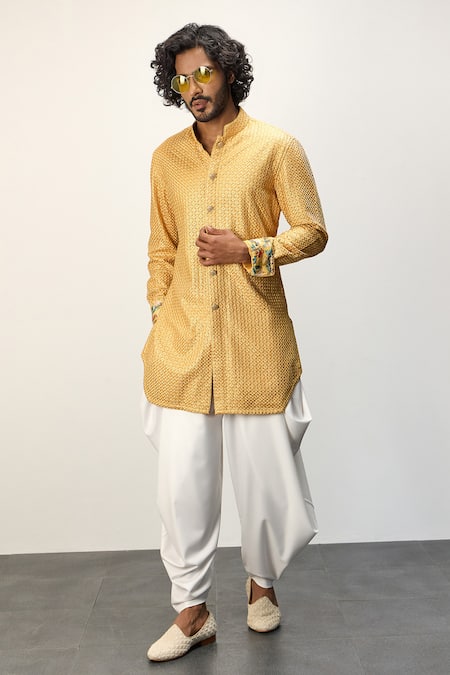 Yellow kurta featuring thread embroidery with a band collar and long sleeves. Paired with a white dhoti pant.