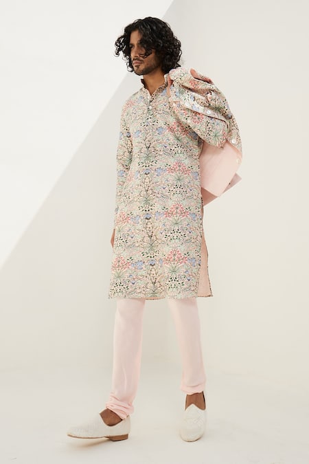 Powder pink kurta featuring floral bageecha print and mandarin collar. Paired with a churidar in silk viscose fabric.