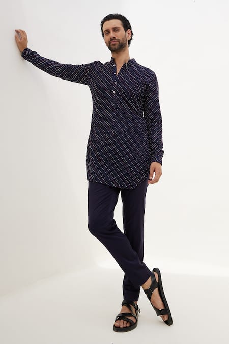 Navy blue kurta featuring embroidered floral motifs with multicoloured french knot embroidery in an angular stripe pattern. Paired with matching pants that include side pockets.