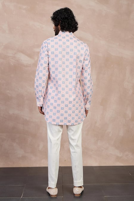 Powder pink kurta featuring floral zaal pattern throughout with printed sleeve hem. Paired with solid white pants.