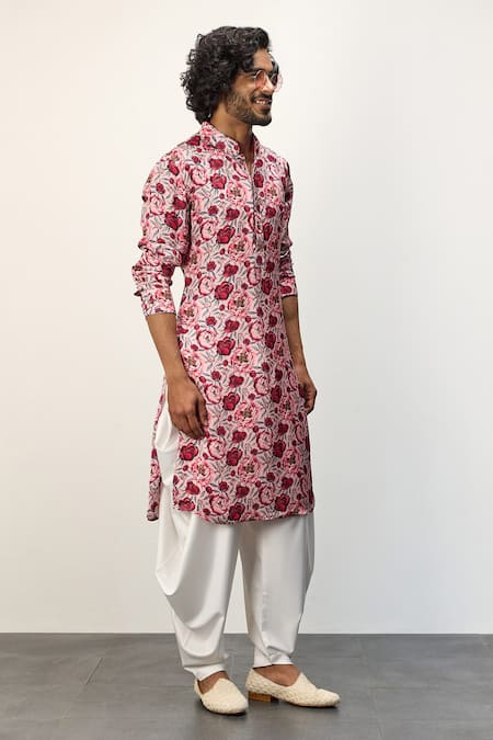 Pink kurta featuring a peony floral print with long sleeves and a band collar. Paired with a white dhoti pant for a traditional look.