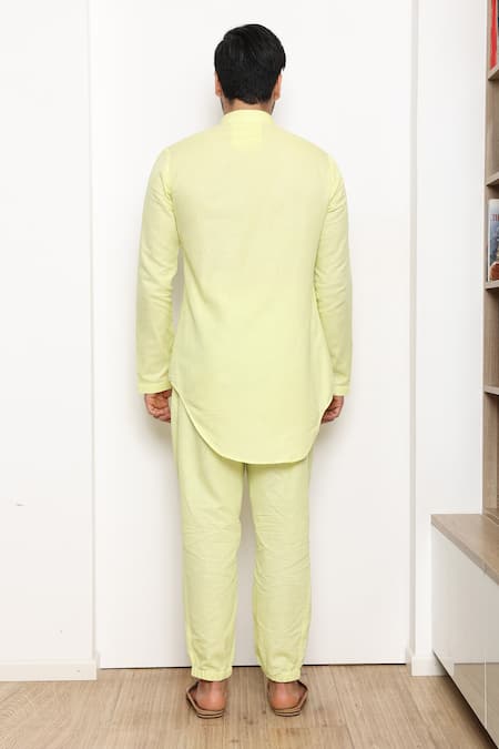 Mint green short kurta with button placket, front-pleated & mandarin collar. Paired with pant.