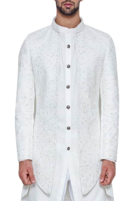 Off-white jacket with all over textured detail and bead work. Comes paired with kurta.