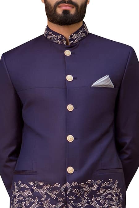 Purple bandhgala with floral embroidered motifs & band collar.
