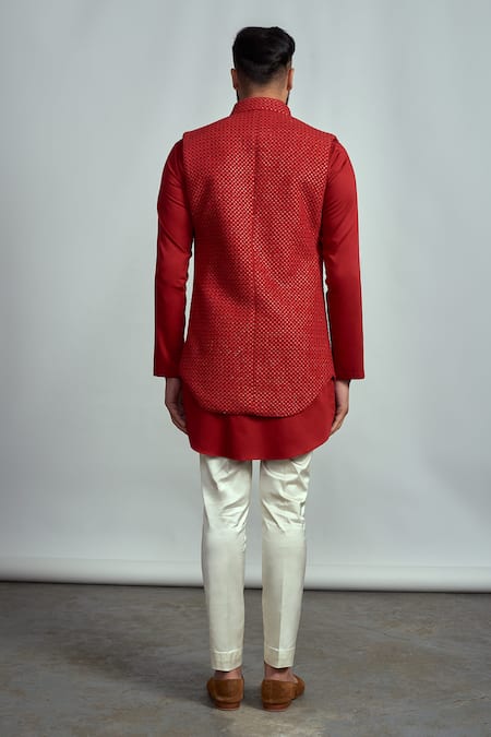 Red bundi with embroidered motifs. Comes with kurta and pant.