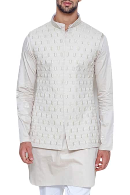 Beige Cotton Silk Embroidered Bundi With Kurta