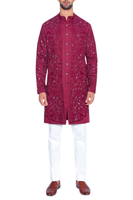 Maroon open jacket with all over floral work. Comes paired with kurta.