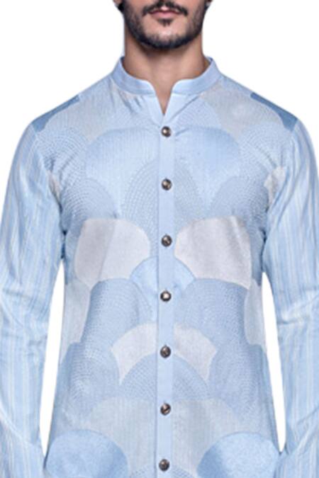 Blue straight kurta with resham embroidered motifs & metal trims.