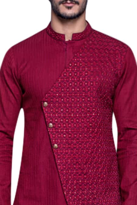 Maroon asymmetrical kurta with resham embroidered motifs & metal trims.