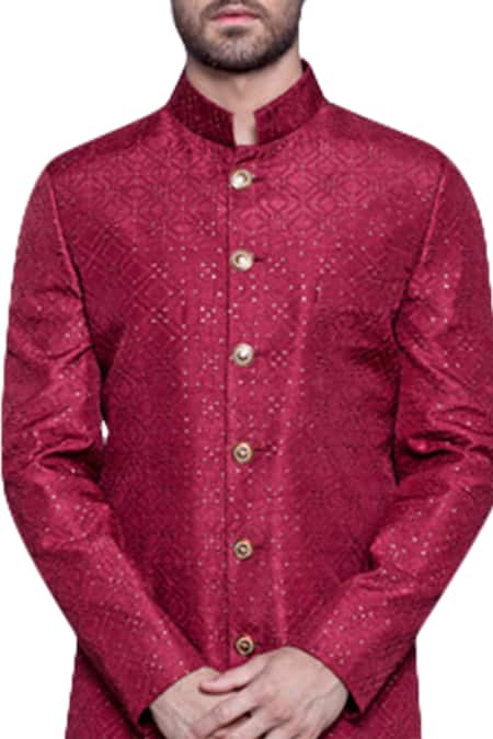 Maroon Lucknowi sherwani with sequin embroidery & band collar.