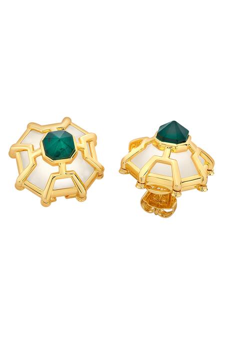 18kt gold plated stud geometric shaped stud earrings embellished with rock crystal, emerald doublet stones.