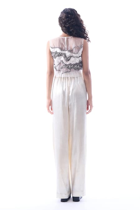 Off white trouser crafted in vegan mashru featuring a wide legged fit with a side zipper