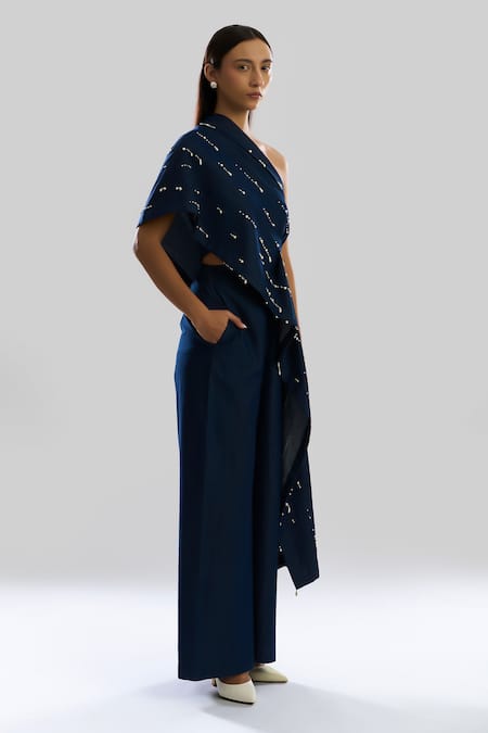 Navy blue core denim pants featuring a buttoned front and side tie-up.