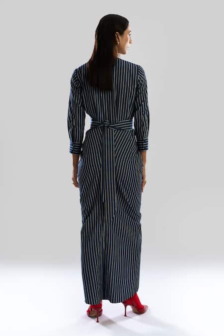 Navy blue dress featuring an offset denim stripe design.