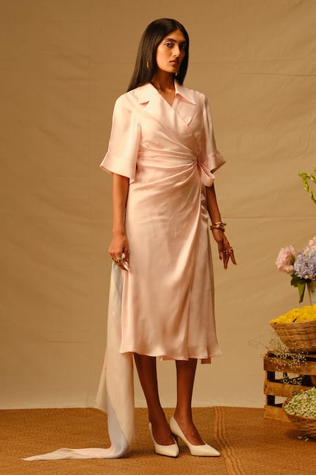 Baby pink shirt wrap dress featuring an asymmetrical collar and half sleeves