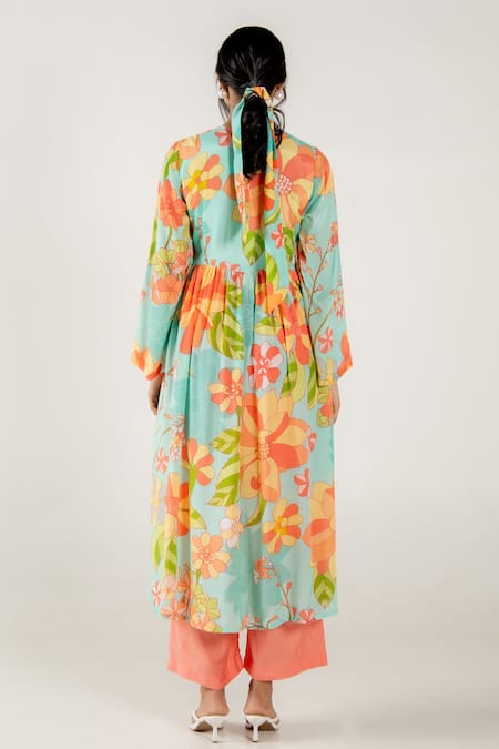 Tiffany blue anarkali featuring chicory print and V neckline. Paired with flared pant for a complete look.
