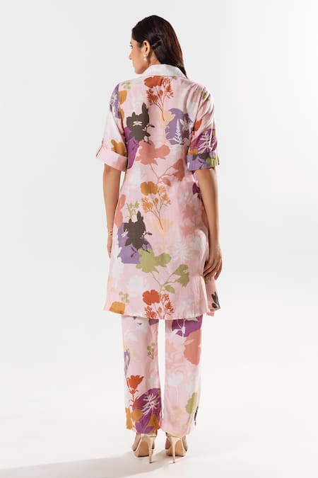 Pink Cotton, Silk Embroidery Collared Floral Print Kurta Pant Set