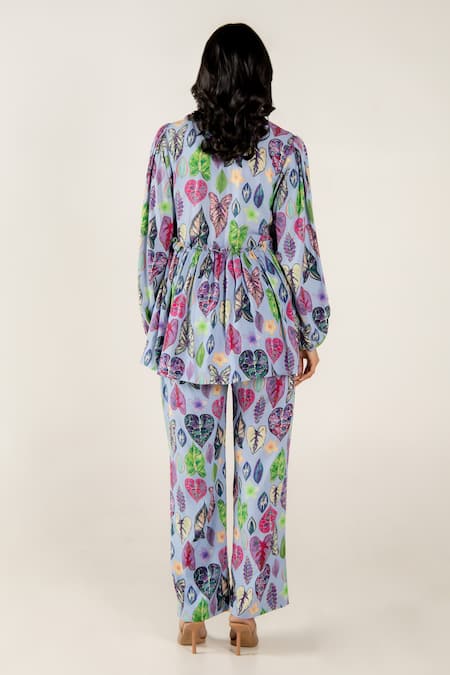 Cornflower blue peplum top featuring a collar, puffed sleeves, and gathered waist. Paired with matching printed pants showcasing vibrant leaf patterns.