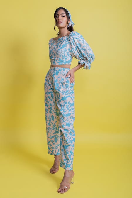 Champagne beige and sapphire blue floral printed top with a sweetheart neckline and puff sleeves. Paired with cigarette fit pants for a coordinated look.