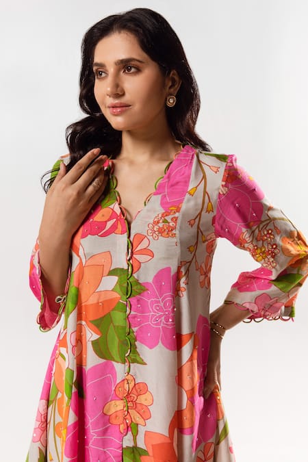 Scallop string neck detail, Hand embroidery embellishments, All over blossom print